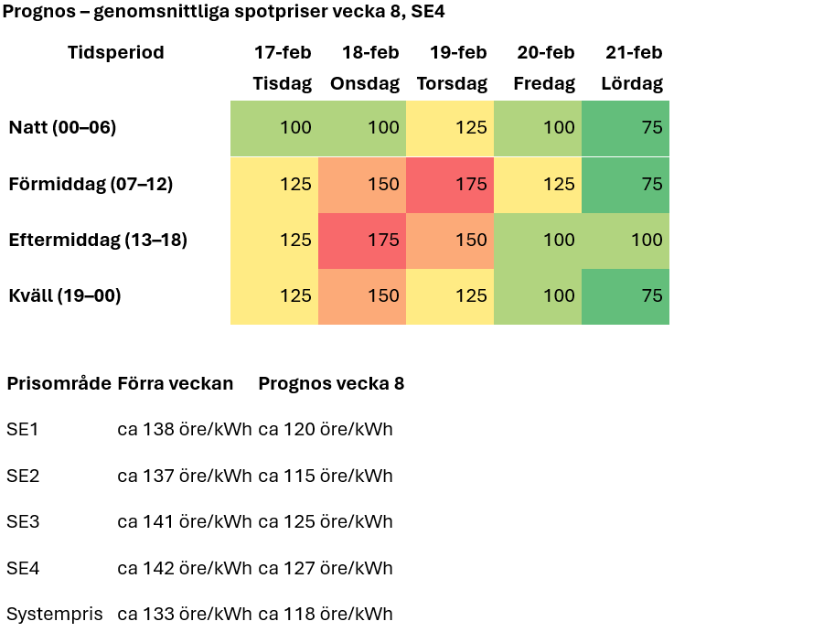 Sammanfattningsvis ser vi en viss lättnad jämfört med förra veckan, men prisnivån är fortfarande hög i ett historiskt perspektiv och känslig för förändringar i temperatur och vind.