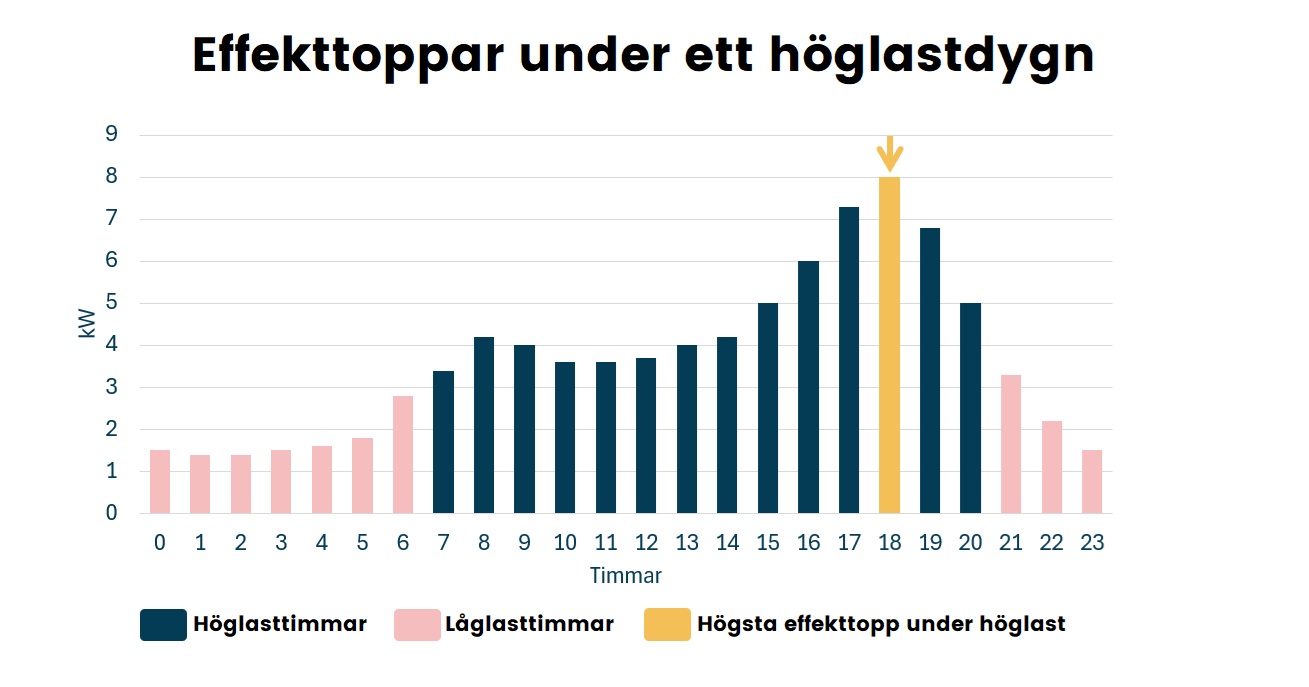 Varje dygn sammanställs 24 sådana timvärden för ditt hushåll. För de flesta är effektuttaget som högst under morgon- och kvällstimmarna, när många använder el samtidigt.