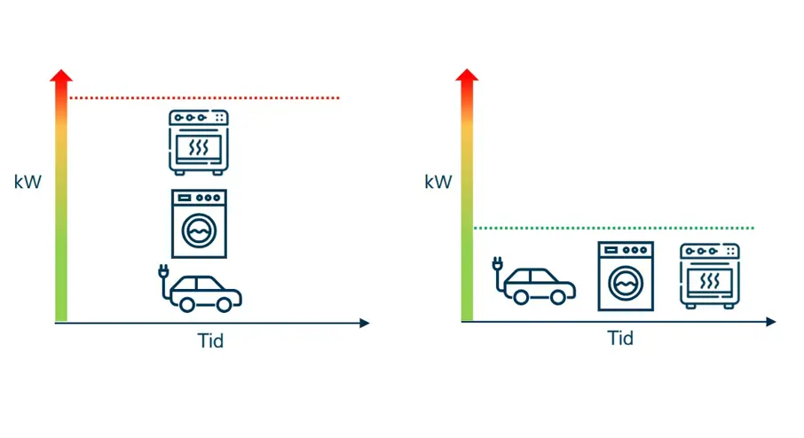 Samma princip gäller i hemmet. Om du använder diskmaskin, tvättmaskin och torktumlare samtidigt behöver du mer effekt än om du kör dem vid olika tillfällen.